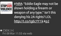 “The NRA does not allow Eddie the Eagle to speak, isn’t this denying his 1A rights? LOL.”